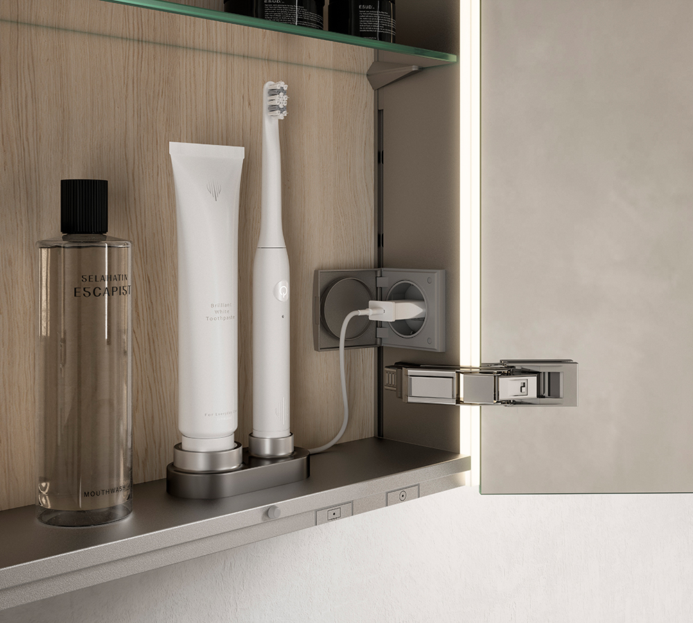 Im reduzierten Look des Korpus verbirgt sich das großzügige Innenleben. Dies beinhaltet viel Stauraum und praktische Details erleichtern den Alltag. Die Glasböden können so angeordnet werden, wie sie für die großen und kleinen Pflegeprodukte benötigt werden. Eine seitlich angebrachte Steckdose ermöglicht das Laden der Zahnbürste im Spiegelschrank. Sie ist mit einem Klappdeckel geschützt und kommt zum Vorschein, wenn sie gebraucht wird. Soft-close Scharniere sorgen für leises und sanftes Schließen der Türen, auch wenn diese mal schwungvoll geschlossen werden. Dank beidseitig verspiegelter Türen kann man sich auch von hinten betrachten.